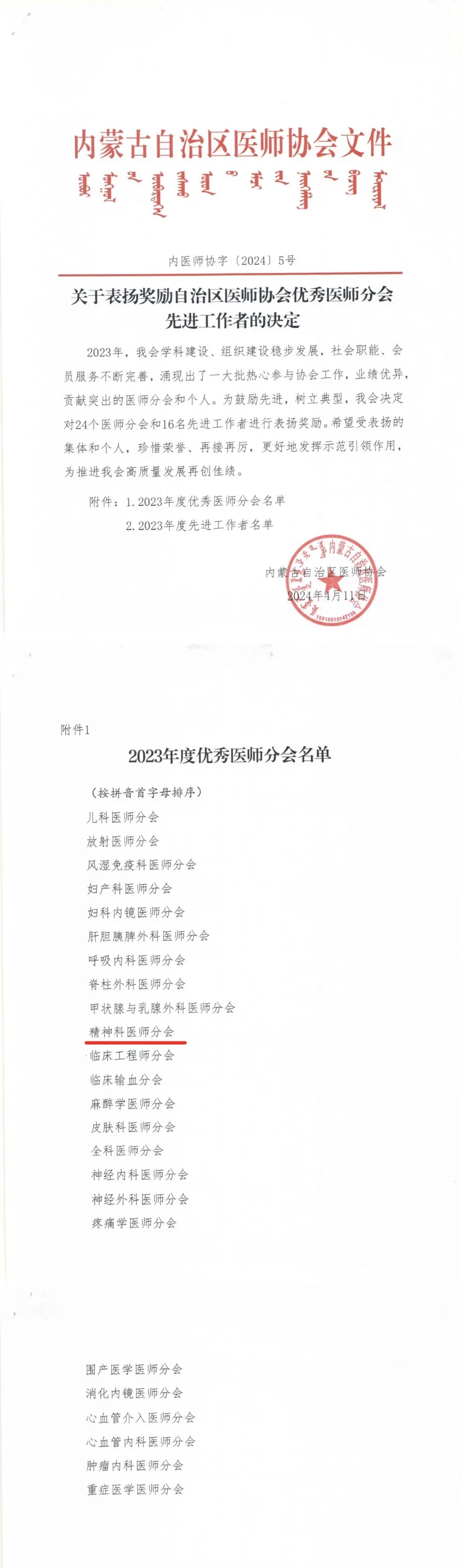 2023年4月11日,在全区三级医院高质量发展研讨会暨自治区医师协会2024年工作会议上,内蒙古自治区医师协会精神科医师分会继2018年荣膺“内蒙古自治区医师协会优秀医师分会”的荣誉后,再次获此殊荣,陈丽霞会长参会并接受颁奖表彰。这一成就不仅体现了分会成员不懈追求与专业奉献的显著成果,也象征着精神科同仁们在推动全区精神卫生中事业上作出的杰出贡献。