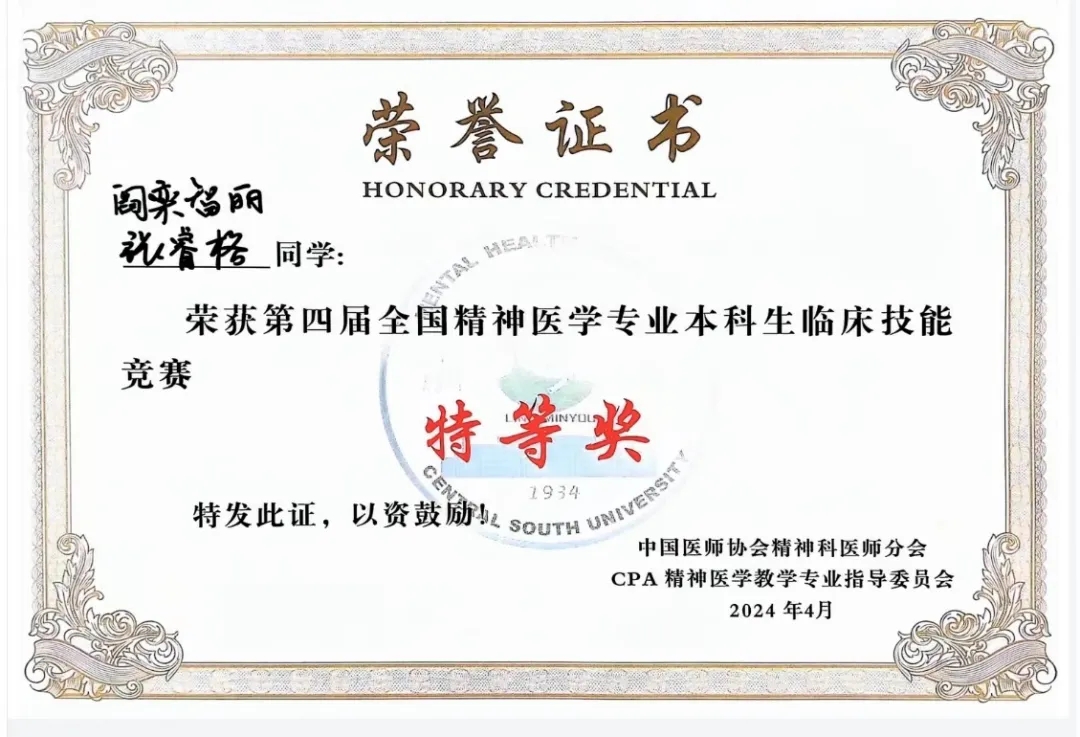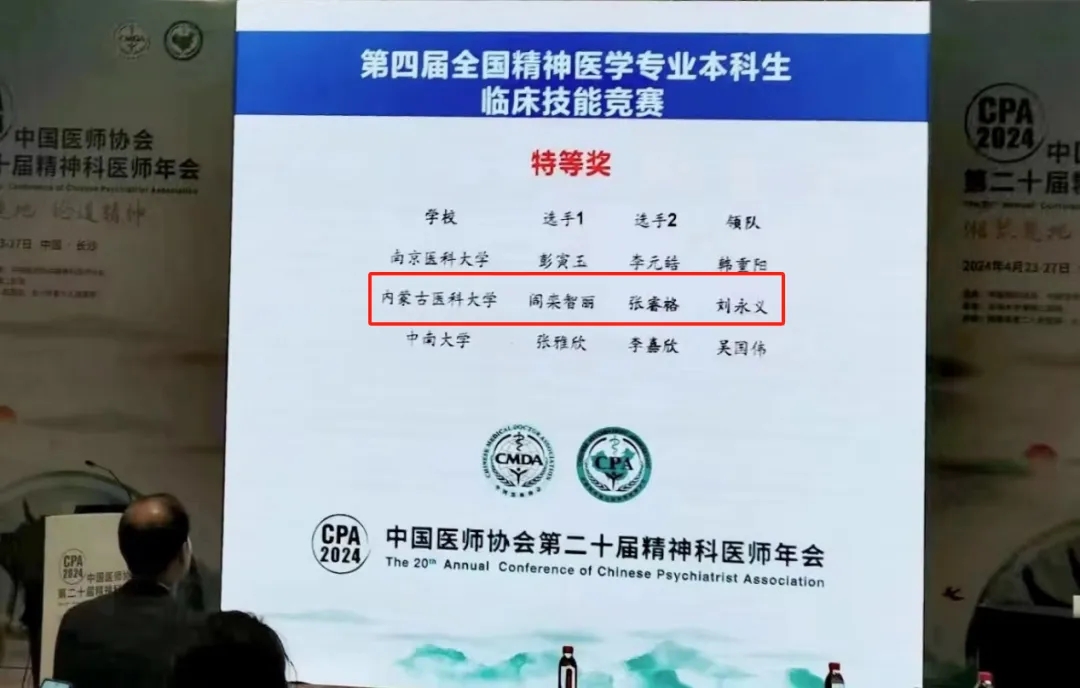 2024年4月25日-26日,由中国医师协会精神科医师协会(CPA)和CPA精神医学教学专业指导委员会主办,国家精神疾病医学中心(中南大学湘雅二医院)承办的第四届全国精神医学专业本科生临床技能竞赛在长沙市举行。本次竞赛旨在推动精神医学专业临床实践教学改革,创新实践教学体系,加强精神卫生专业医学生临床基础理论、基础知识、基本技能和人文关怀精神的培养,全面提升精神医学专业医学生综合素质和人才培养质量。经过两天激烈角逐由精神卫生学院2019级精神医学本科生阎栾智丽和2020级精神医学本科生张睿格组成的内蒙古医科大学代表队首次参赛荣获本次竞赛最高奖项—特等奖。本次竞赛含临床基本技能操作:包括双人法心肺复苏术、腰穿。精神科专业技能包括精神疾病患者病史采集、精神状况检查,诊断和治疗策略的医患沟通。充分考核了参赛选手的人文关怀、临床思维、临床技能、团队合作、医患沟通、临床应急应变等综合能力。