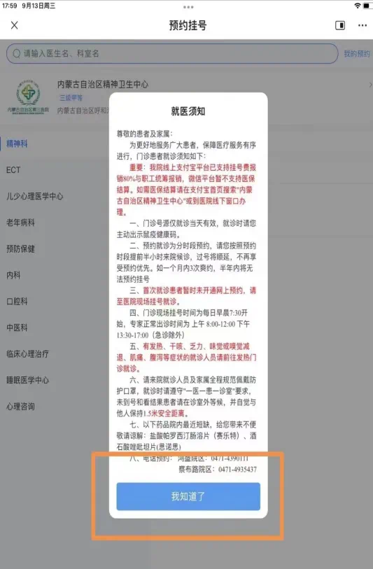 ”公众号,点击“预约挂号”,点击“我知道了”,选择“乌兰察布路院区”
