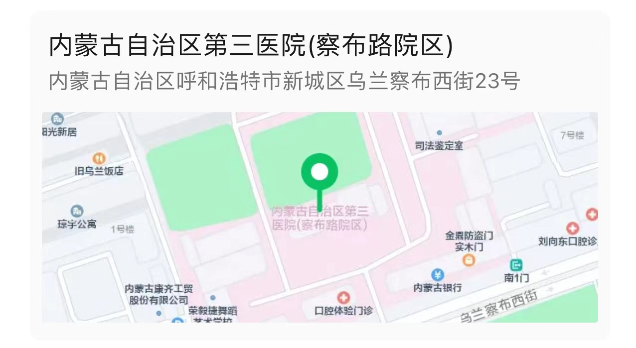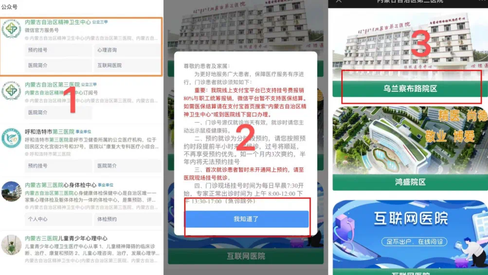 ”公众号,点击“预约挂号”,点击“我知道了”,选择“乌兰察布路院区”