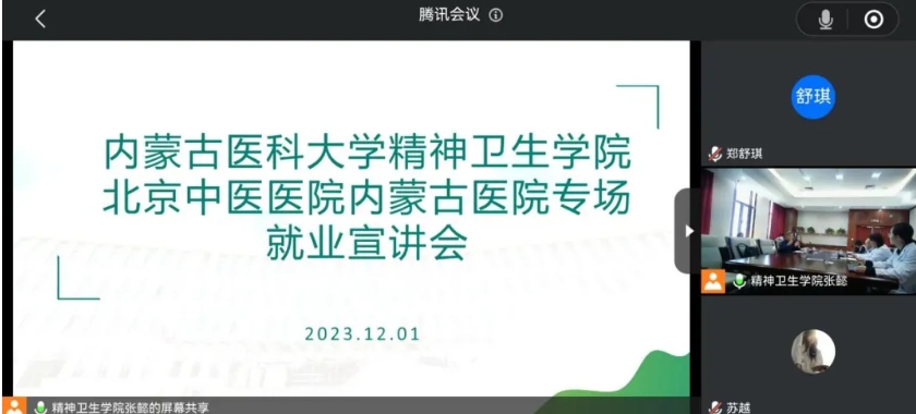 党的二十大报告指出“就业是最基本的民生”,党政领导始终高度重视就业工作,多措并举促就业,内蒙古医科大学精神卫生学院于2023年12月1日,在鸿盛院区门诊楼4楼1号会议室组织2024届巴彦淖尔市周边生源地精神医学本科生、精神病与精神卫生学硕士研究生,通过线上线下结合的形式参加北京中医医院内蒙古医院专场就业宣讲会。党委副书记仝利俊和相关职能科室参会。