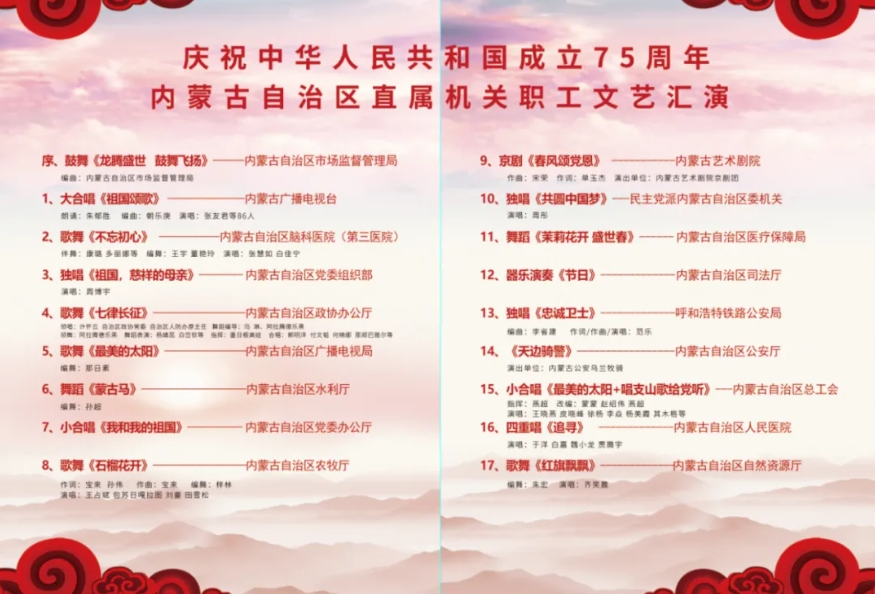 9月23日——24日,庆祝中华人民共和国成立75周年内蒙古自治区直属机关职工文艺汇演在内蒙古自治区文化馆举行。演出由内蒙古自治区直属机关工委、内蒙古广播电视台共同主办。中文黄色网站