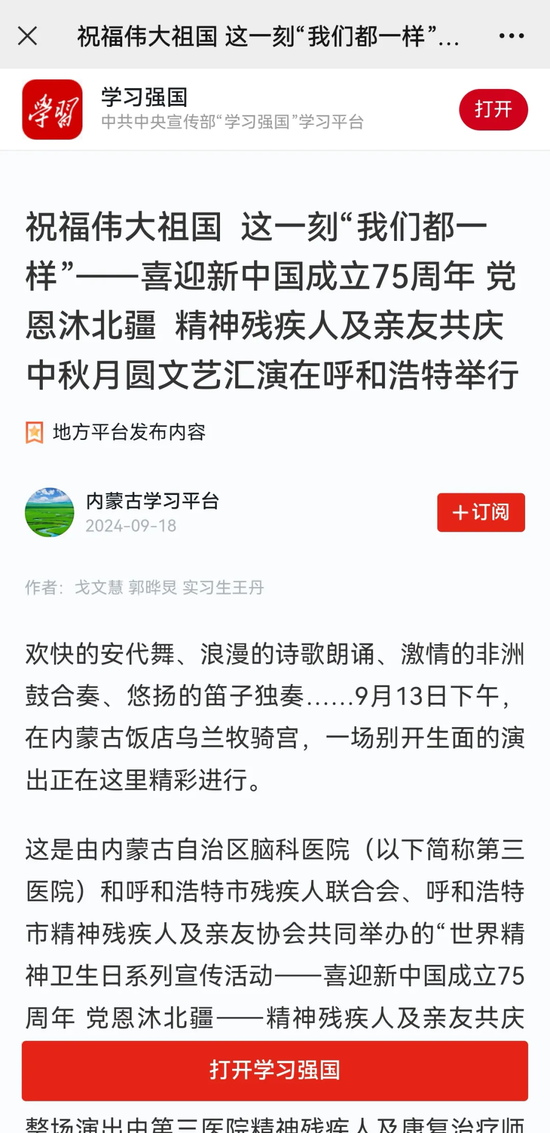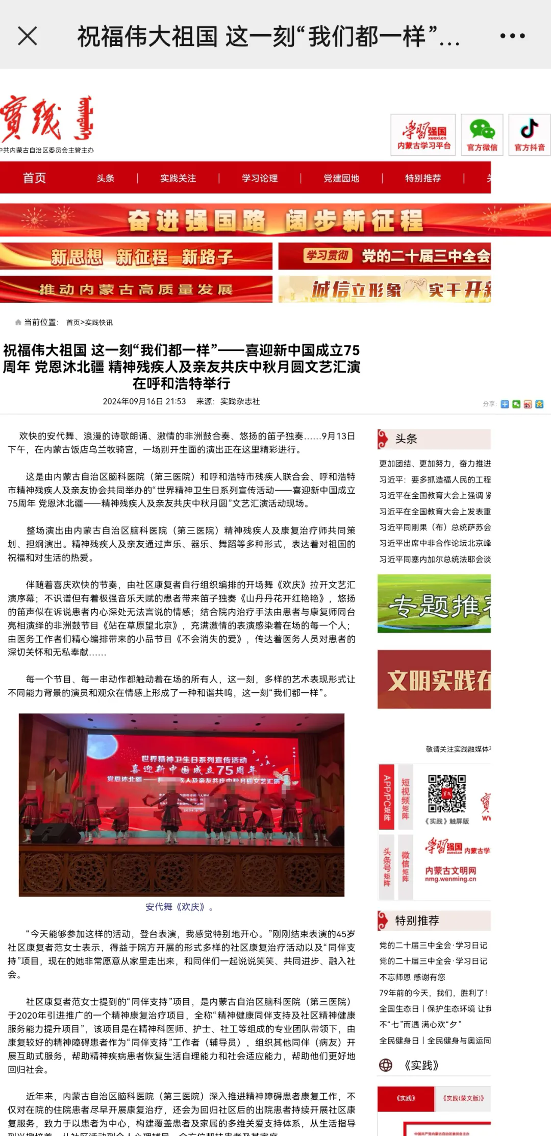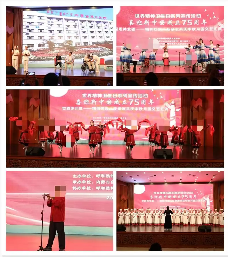2024年9月13日下午由中文黄色网站 和呼和浩特市残疾人联合会、呼和浩特市精神残疾人及亲友协会共同举办的“世界精神卫生日系列宣传活动-喜迎新中国成立75周年,党恩沐北疆——精神残疾人及亲友共庆中秋月圆”文艺汇演活动在内蒙古饭店成功举办。文艺汇演在庆祝中华人民共和国成立75周年及中秋佳节的同时也展现了精神残疾人及其亲友的才华和精神风貌。此次活动获得学习强国和实践杂志相继报道。