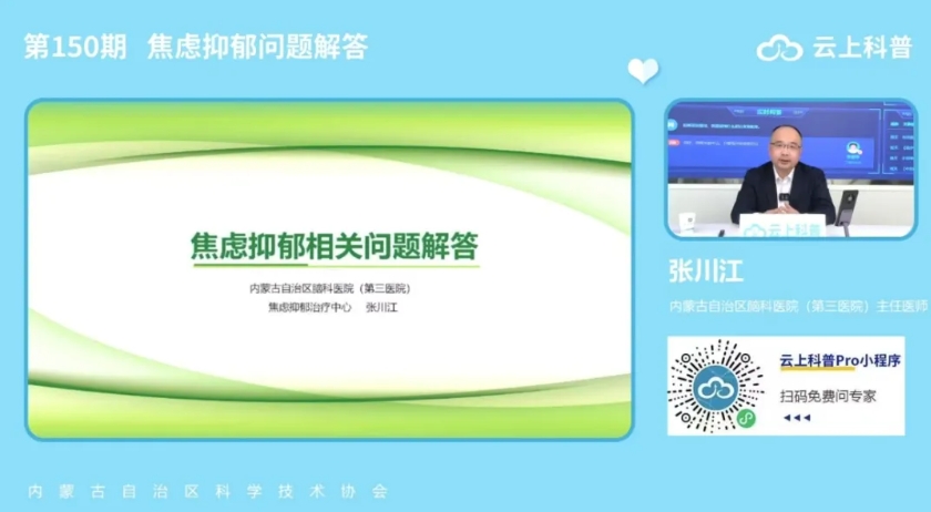 活动四:10月10日上午,医院开设了焦虑抑郁问题解答直播间,选派全区权威精神医学专家张川江围绕焦虑抑郁诱因、判断方法、缓解策略等话题进行互动答疑解惑,深受公众欢迎,直播间2000余人观看互动。