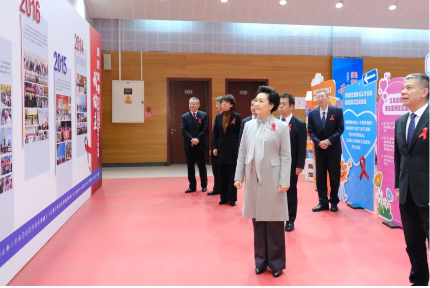 彭丽媛教授等参观“美好青春我做主”红丝带青春校园行十年历程展示彭丽媛教授与参与京津冀高校防艾知识宣传的大学生代表亲切交流