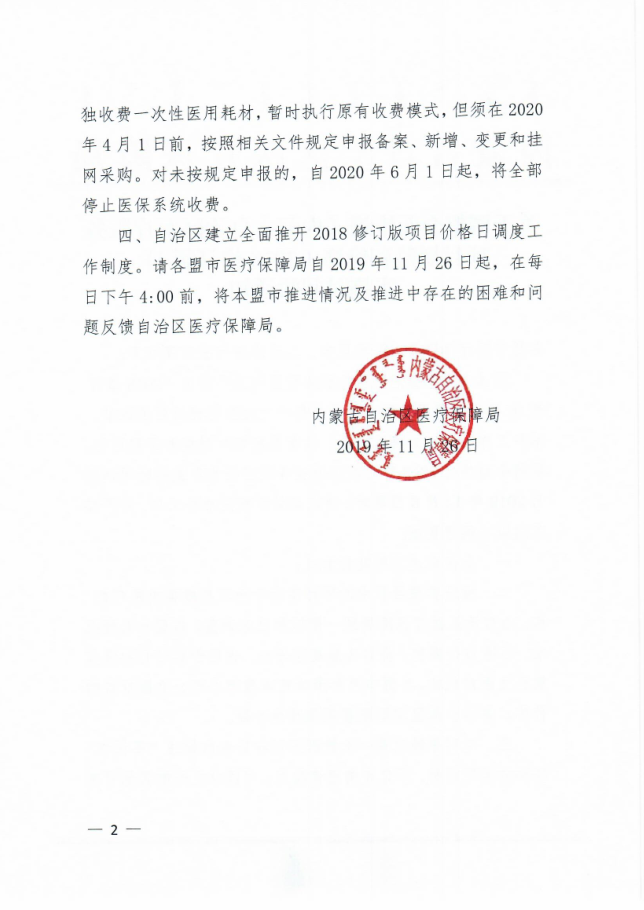 为贯彻落实《关于印发深化医药卫生体制改革2019年重点工作任务的通知》、《国务院办公厅关于治理高值医用耗材改革方案的通知》及自治区医疗保障局 卫生健康委 市场监督管理局联合印发《关于全面推进内蒙古自治区医疗服务项目和价格(2018修订版)实施工作的通知》(内医保发〔2019〕10号)的要求,决定全区15个统筹地区于2019年12月6日零时起全面实施2018修订版目录,同步取消医用耗材加成。