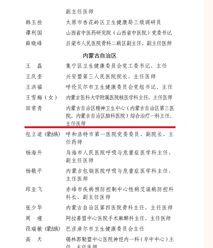 精神康复治疗中心、综合治疗一科主任田常青荣获全国卫生健康系统“先进工作者”称号。