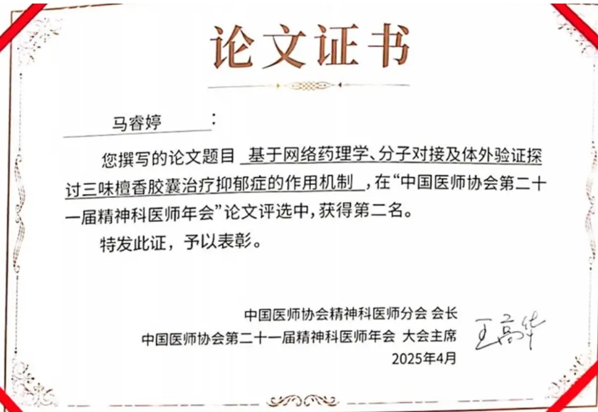 医学检验科主管药师马睿婷撰写的论文《基于网络药理学、分子对接及体外验证探讨三味檀香胶囊治疗抑郁症的作用机制》荣获大会论文评审第二名、壁报评审第二名。