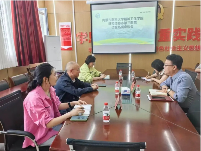 党委副书记仝利俊、教学部相关人员前往呼和浩特市第三医院进行了访企拓岗座谈会,呼和浩特市第三医院党支部书记、院长孙志连、副院长甘燕子、科教科、人事科、党办(宣传)、医务、教学、护理、精防办等相关人员参加了此次会议。