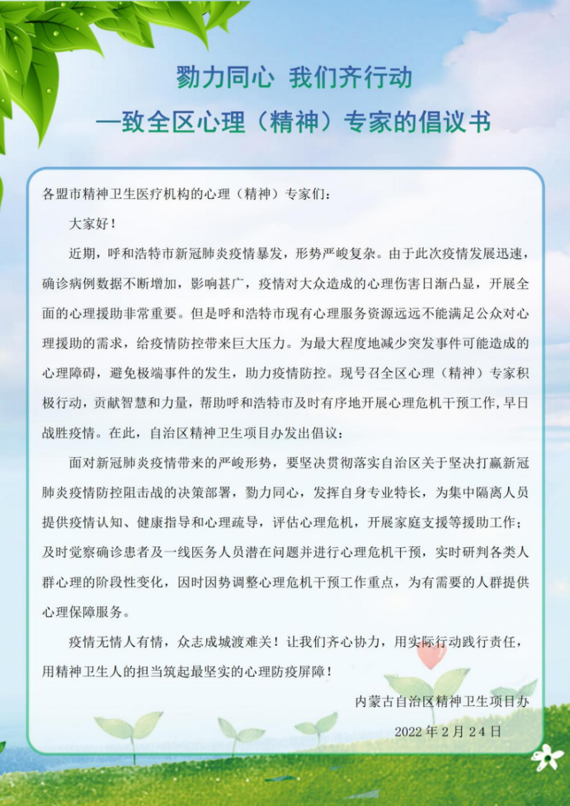 十二个医疗中心和十二个盟市,充分发挥专业优势,科学、规范地开展疫情期间呼市定点医院、隔离酒店、管控小区、封控小区(村)的心理危机干预工作。